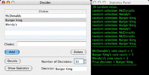 1. When using the font panel to change the text font name or size of the statistics window in the preferences window, the font panel may stop responding to user actions if settings other than the font name or size are changed. 2. The statistics panel background color won't change when the Decider window or statistics panel is front. This and the above issues are maybe because how I implemented fake bindings for the background color and use of the font panel/manager. 3. Currently implemented, there is only one random number generator in use by Decider. This is by design. |